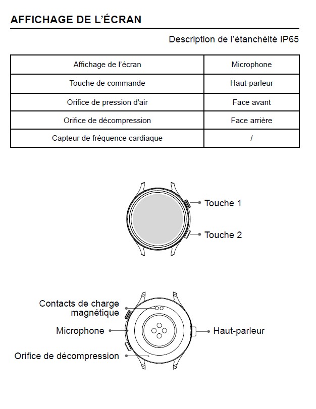 Fonctions : Heures, minutes, dates , Podomètre (calcul du nombre de pas) , Réveil, Barômètre, téléphone,protocole d'entrainement,fréquence cardiaque, oxygène sanguin,stress,cycle sommeil, boussole, météo, musique, appareil photo,chercher le téléphone, calculatrice,calendrier, jeux