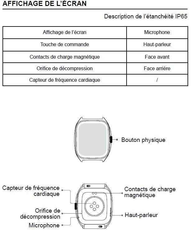 Fonctions :  Heures, minutes, dates , Podomètre (calcul du nombre de pas) , Réveil, Barômètre, téléphone,protocole d'entrainement,fréquence cardiaque, oxygène sanguin,stress,cycle sommeil, boussole, météo, musique, appareil photo,chercher le téléphone, calculatrice,calendrier, jeux