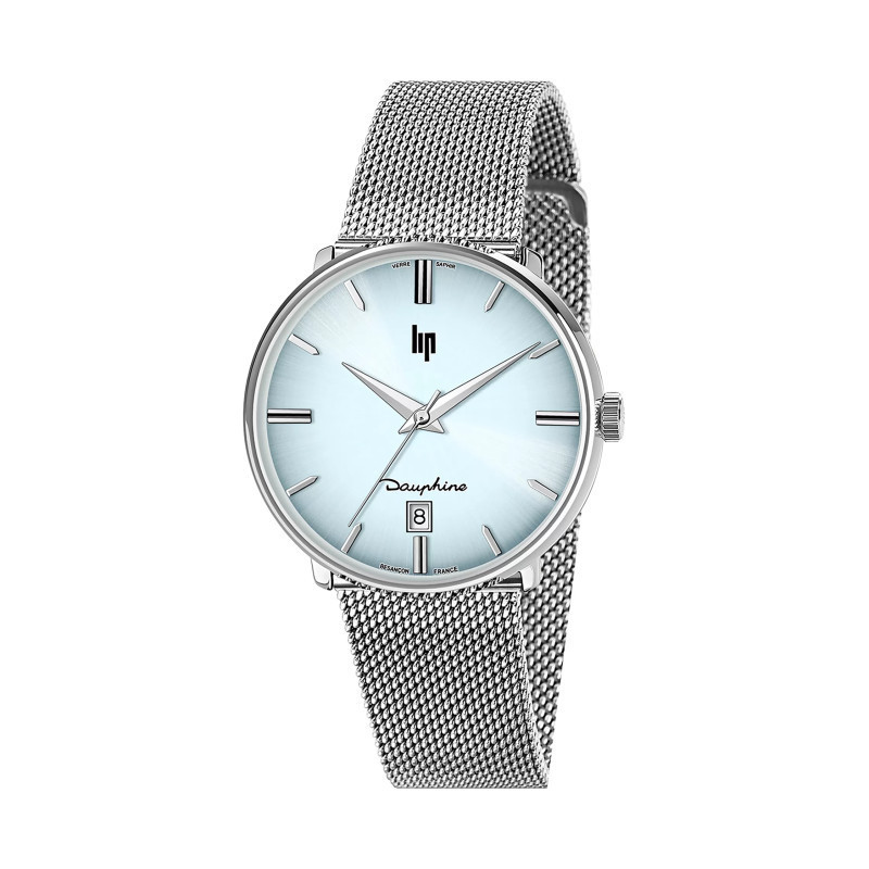 Cette montre LIP Dauphine pour homme et femme arbore un boîtier contemporain argenté, un cadran soleillé bleu. Avec son style vintage tout droit sorti des années 1950, c’est un véritable symbole de l’horlogerie française.