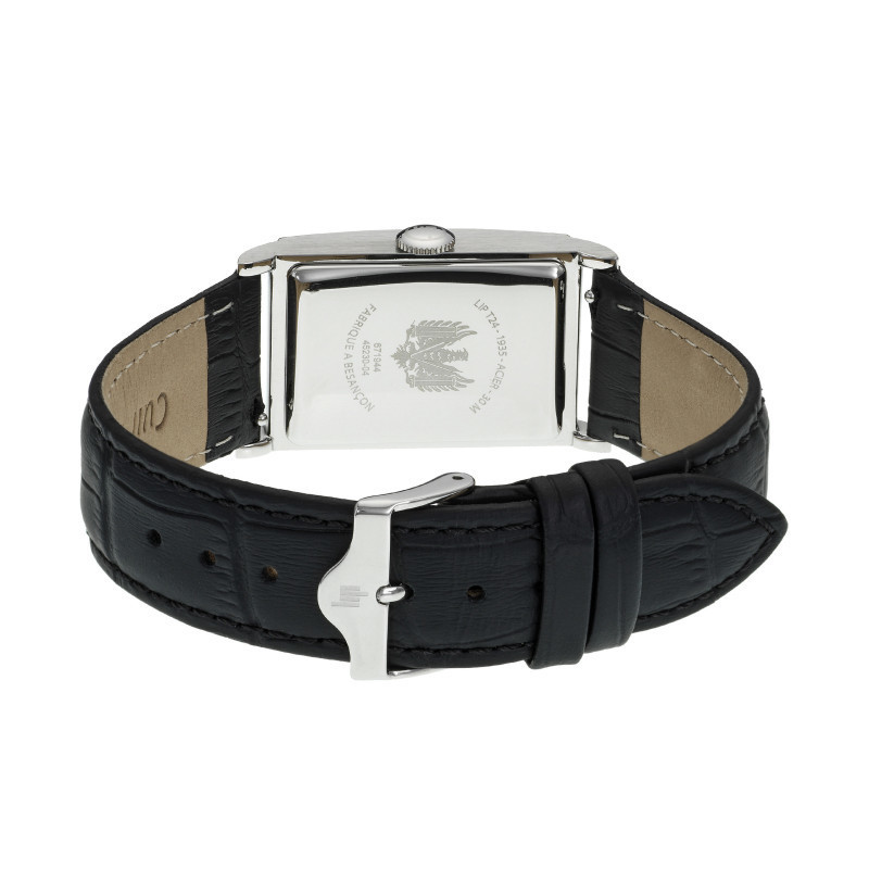 Cette Lip est emblématique du style Art Déco.Inspirée des modèles historiques de la Maison Française Lip. Avec son boîtier rectangulaire et ses chiffres argentés arabes,elle incarnera à votre poignet le raffinement classique et le charme vintage revisité. La T24 va vous séduire par son design équilibé et sa finesse.